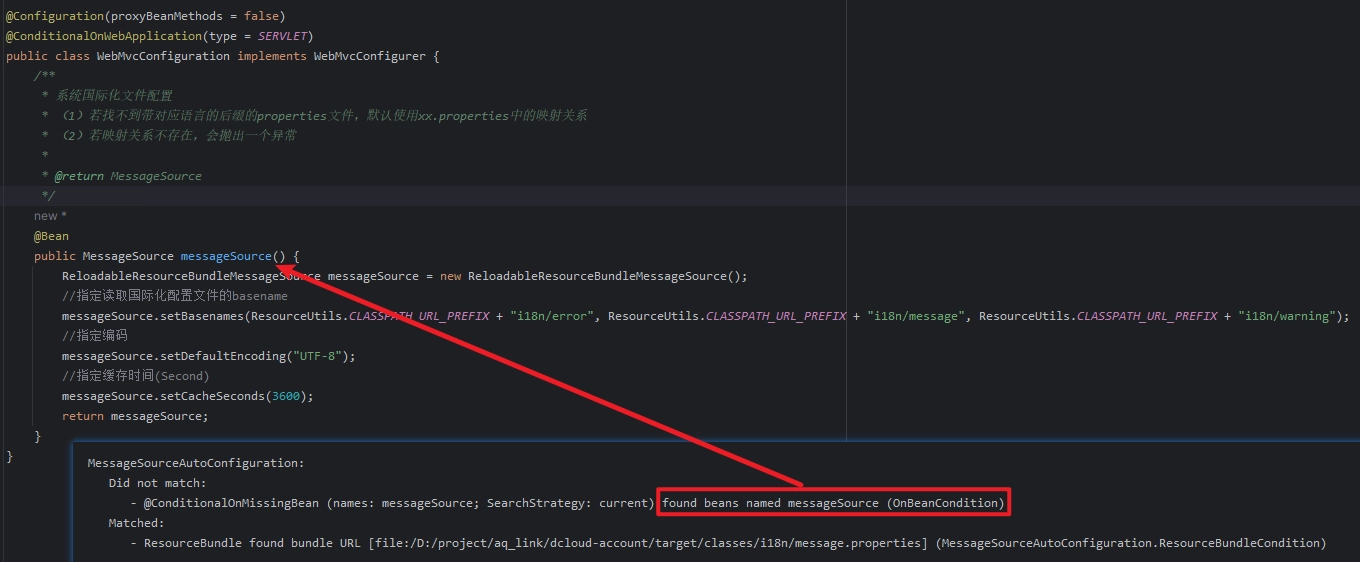 【最佳实践】配置类封装-国际化MessageSource 注解的作用主要是控制是否使用CGLIB代理来代理@Bean方法。当设置为true时,被@Bean标识的方法会被 CGLIB 代理,同时也会遵循 Spring 容器的一些生命周期行为,比如和@Destroy。如果这些@Bean方法返回的是单例 Bean,那么在同一个配置类中多次调用这些方法,得到的都是同一个 Bean 实例,因为该 Bean 只会被初始化一次。当设置为false时,被@Bean标识的方法不会被拦截以进行 CGLIB 代理,也不会遵循 Spring 容器中的生命周期行为。