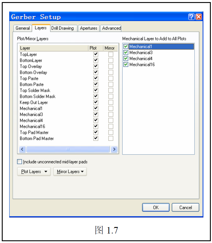 1.6.1 使 用 菜 单 “File\Fabricationoutputs\ gerber files”, 打开gerber设定界面. 图1.7