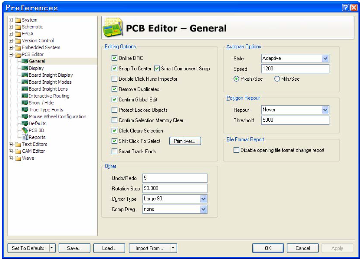 PCB 优先选项设定对话框设定和PCB 操作相关的参数,可以通过 Tools\preferences 命令进入.这些设定会保存在系统环境中,打开不同的PCB 会使用相同的设定项.