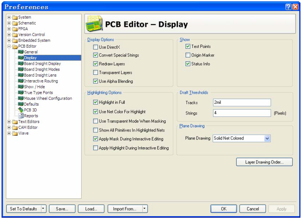 Plane drawing: 设定平面层显示的方式, 选择 “outlined layer control”或“outlined net control”时,以负片格式显示,如一段走线表示这一段没有铜皮. “solid net color” 则以半透明的方式显示平面层上的网络