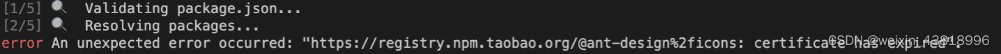 yarn 在install 时出现error An unexpected error occurred yarn config list 是一个 Yarn 命令,它用于列出当前 Yarn 配置的所有选项和其对应的值。这个命令可以帮助你查看当前的 Yarn 配置,以及检查是否有任何自定义的配置选项。这个命令用于在全局范围内设置 Yarn 的 "strict-ssl" 选项为 false。这意味着 Yarn 将不再严格验证 SSL 证书,这可能会在某些情况下带来安全风险。请注意,修改全局配置可能会影响所有项目的行为,因此在设置全局配置时要格外小心。经过我一顿百度找到了个可以解决的方法。