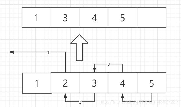 删除操作和插入操作有异曲同工之妙,两个操作本身也就是互补的。在进行删除操作时,为了保证连续的内存空间,后面的元素必须向前挤,所以也是O(n)的复杂度
