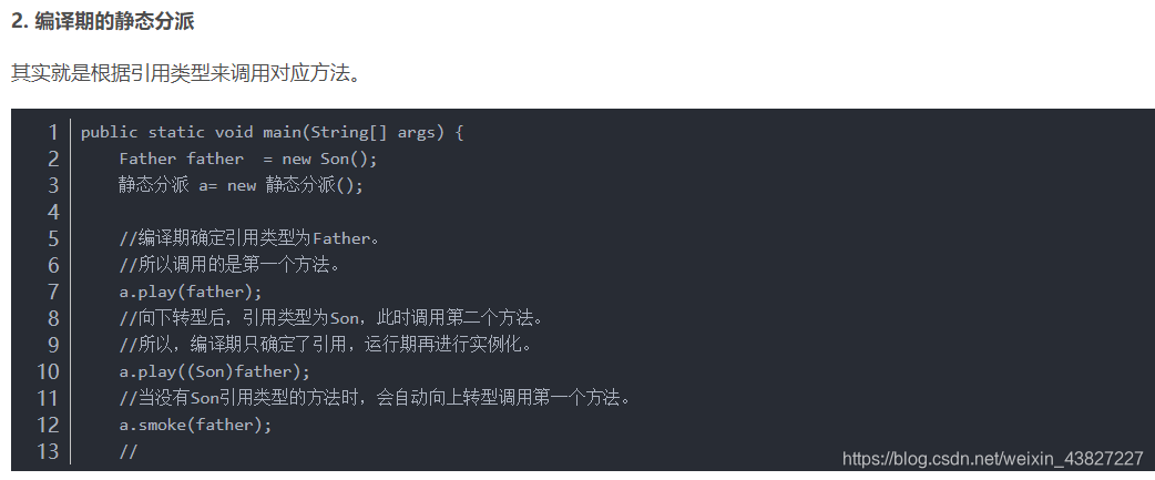 前期绑定:非面向对象编程,编译器会产生对一个具体函数的调用,运行时调用代码的绝对地址。c语言的调用就是前期绑定,而java除了static和final方法,其他都是后期(动态)绑定,换一个角度来说:多态不能作用于static和final