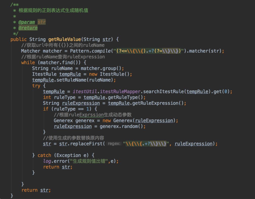 ITest 在规则管理中可以根据需求配置固定规则,规则为一个 Map 组成,key 值在接口创建时使用 {{}} 扩起来进行引用。Value 分为固定值、随机值,随机值使用 Generex 工具生成。当 value 是一个标准的正则表达式时就会按照表达式随机生成值,完成参数化响应值提取。