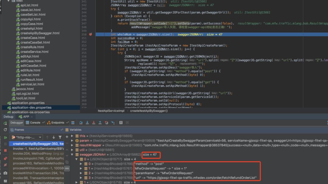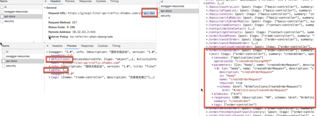 Swagger 文档中的接口信息是通过 api-doc 请求获取的,需要解析其返回值,并按照需求提取出想要的信息。关键点在于它把接口定义在 definitions 字段,路径等其他信息在 paths 字段,并不是按照我们所看到的方式去编排,而且入参会包含多重对象。想解析它,首先需要获取接口定义,然后根据接口定义获取 paths 信息,最后实现递归取到所有对象信息,然后封装成 ITest 中 API 的格式入库保存。
