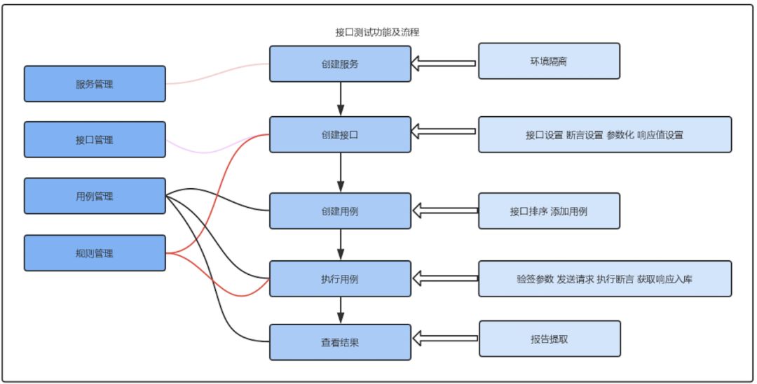 接口管理:简称 API,作用是对接口主要参数进行管理,包括所属服务、名称、URL、描述、断言等;配置参数定义简称 apiConfig,包括 header、query、parameter、body、response。其中 URL 及 apiConfig 中可以进行参数化配置;apiConfig 中 response 用来存储该接口需要保存的返回值。