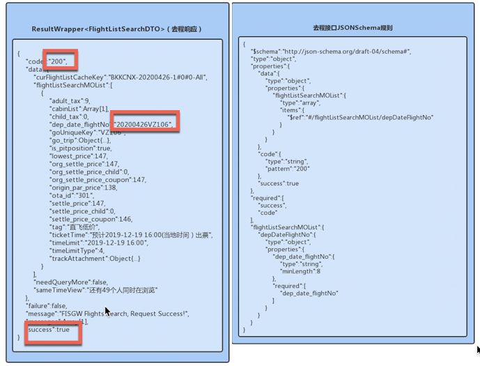 比如校验航班去程列表接口返回是否正常,同时是否包含航班号。这就是一个多层断言的例子,需要从嵌套的 JSON 中解析出需要的值,校验规则如下: