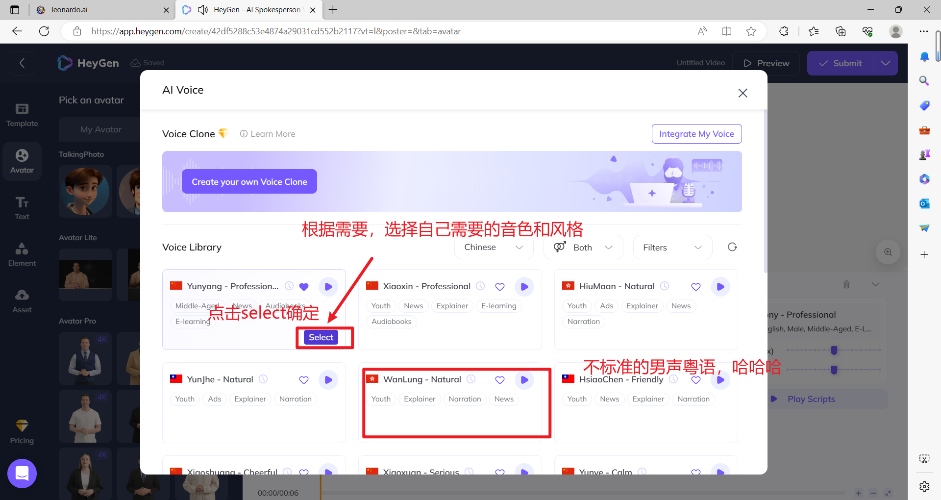 2.5 如下图,按照自己对音色和风格的欣赏,选择需要的语言。