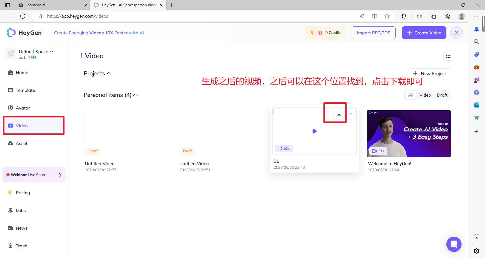 2.7 生成结束之后,就可以下载啦。刚Submit后,会需要等待视频生成的ready的时间,在跳入的界面也是在同个位置下载。(我是生成过一次,所以在主页的Video就能找到以往的记录)