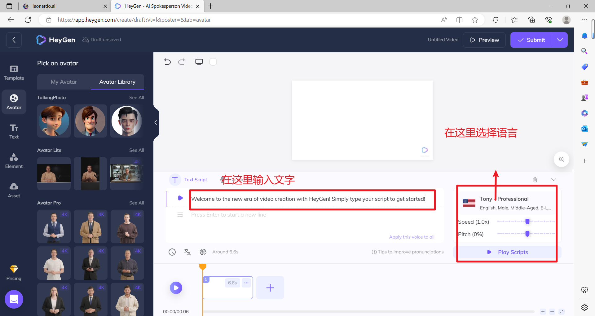 2.6 选择之后,会跳回2.4步骤的界面。在头像模块,选择适宜头像,输入文字,点击播放按钮,确认没问题之后,点击右上角的Submit,提交任务。(!这里需要注意一下,如果是免费的,只能生成约1分钟的视频,且右下角会有HeyGen的水印。)