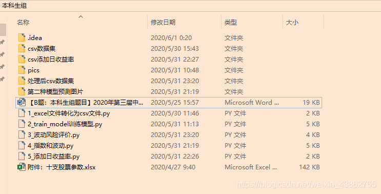 大致说明一下:在这些文件及文件夹里面,本科生组放在的是桌面上!然后是整体在Pycharm里打开,所有生成的.idea是在第一级目录!只有【附件:十支股票参数.xlsx】是必须要的,另外的文件夹都是通过os模块创建的!