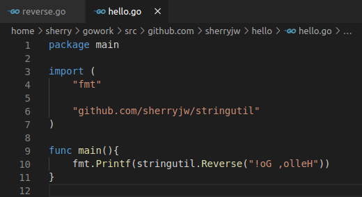 确认 stringutil 包构建完毕后,修改原来的 hello.go 文件,引用自定义的包: