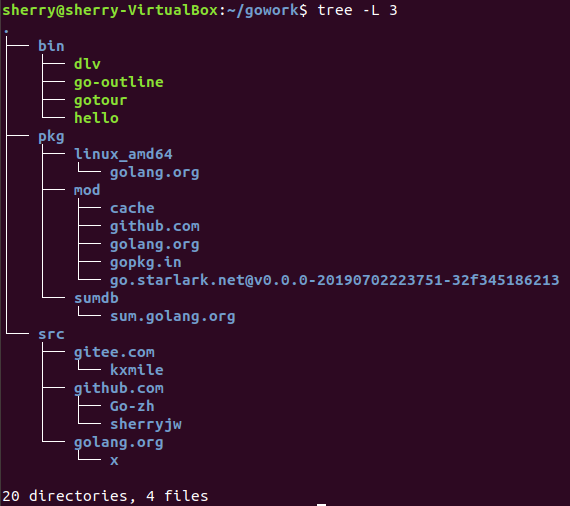 ④. 查看 go 当前工作空间的目录结构,应该和官方文档如何使用Go编程的工作空间一致: