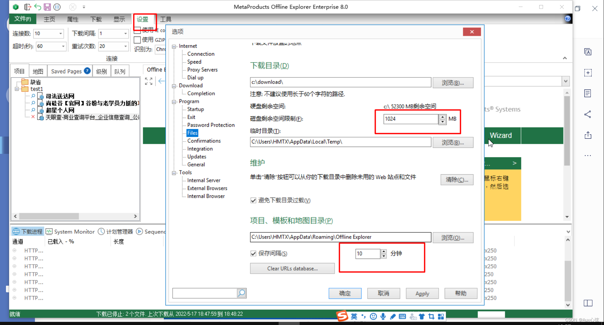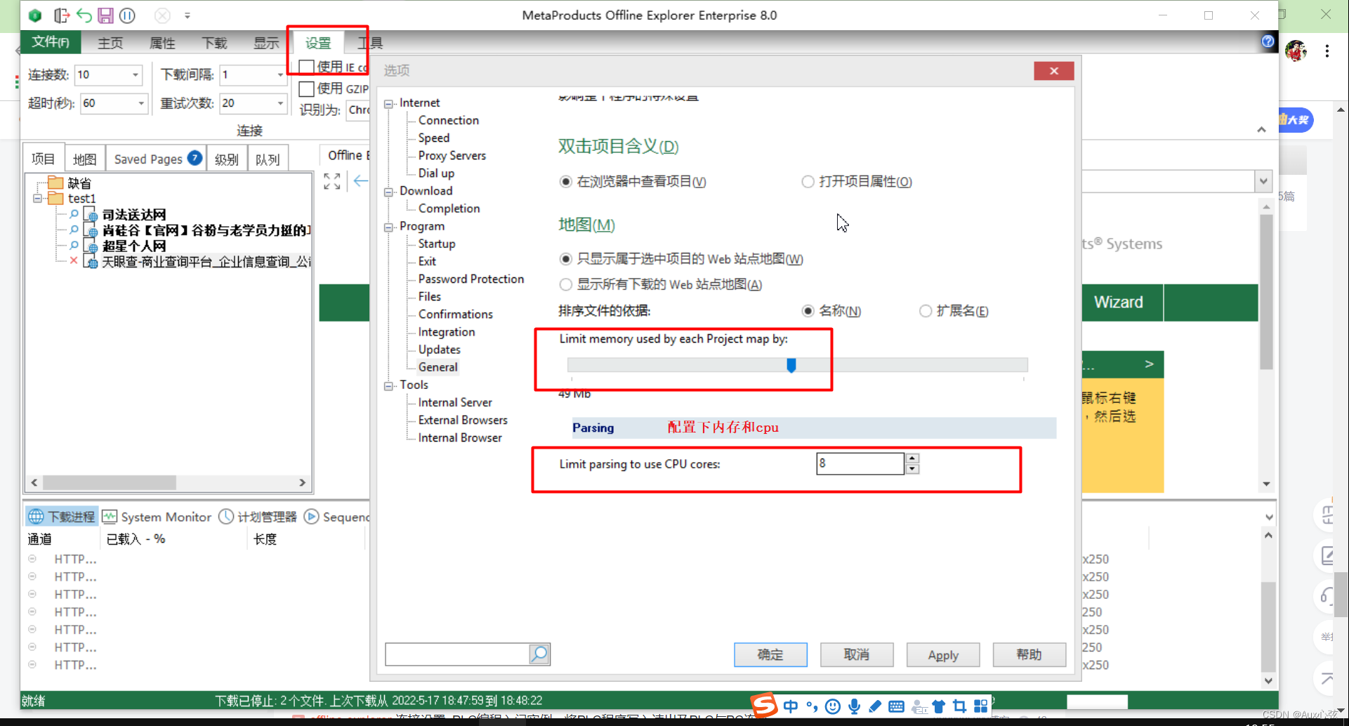 (5)OfflineExplorer可以同时开100个线程下载,界面清爽,可以通过曲线检测下载速度、CPU/硬盘/内存占用。可以方便的把网页转换成EXE或者CHM或者PDF或者MHT.它最大的缺点就是会闪退,就是下载的网站如果是特别大的话,就可可能卡死,目前可能是官方的bug,比如1G单位的网址可以会卡死