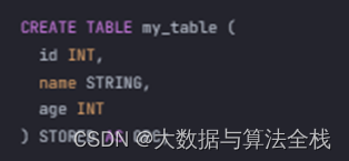 CREATE TABLE my_table ( id INT, name STRING, age INT ) STORED AS ORC; |