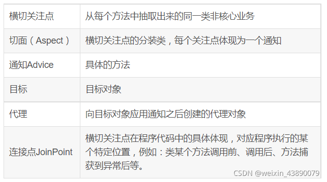AOP的底层核心,就是Java的动态代理机制,AOP中有几个很重要的概念,整理如下表: