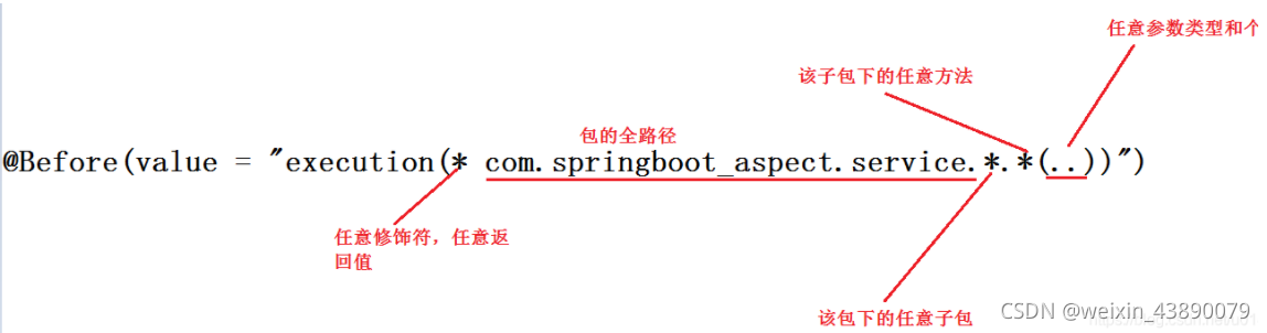 其中每一个注解,都需要指定一个execution切面表达式,即该切面作用在哪一个方法之中,样例如下: