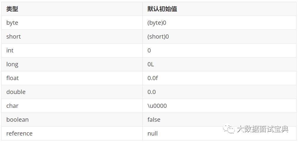 在这个阶段,虚拟机就会为这个类分配相应的内存空间,并设置默认初始值。Java虚拟机为各类型变量默认的初始值如表所示。