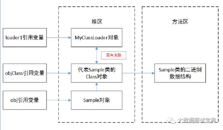 loader1变量和obj变量间接引用代表Sample类的Class对象,而objClass变量则直接引用它。