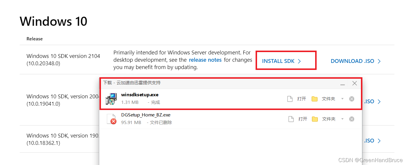 从这个网站下载,如下图,点击对应windows版本的INSTALL SDK,会自动下载一个在线安装程序winsdksetup.exe: