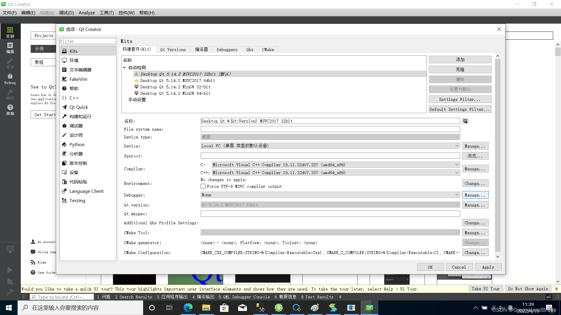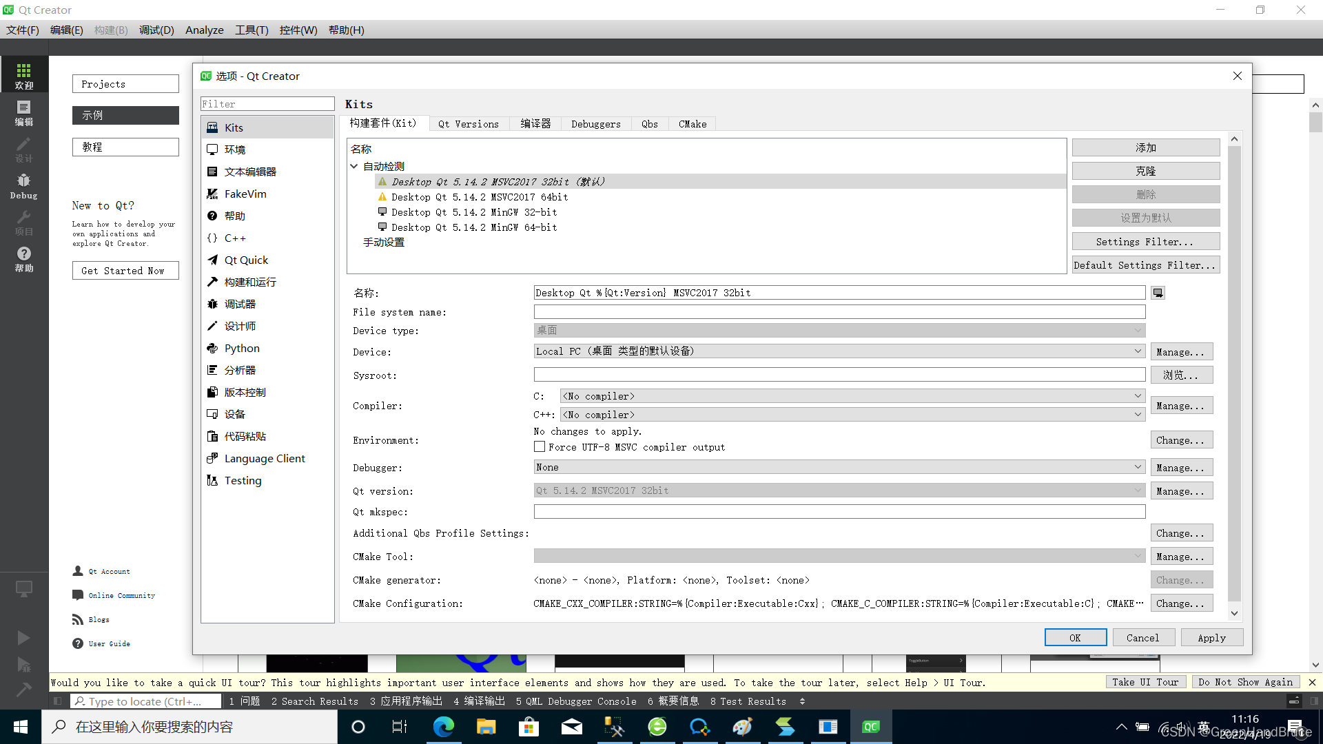 安装完之后,打开qtcreator,这时候,如果你新建程序的时候只需要用mingw编译器的话,那就可以正常开发了,但如果需要msvc编译器的话,还需要设置一下,步骤如下: