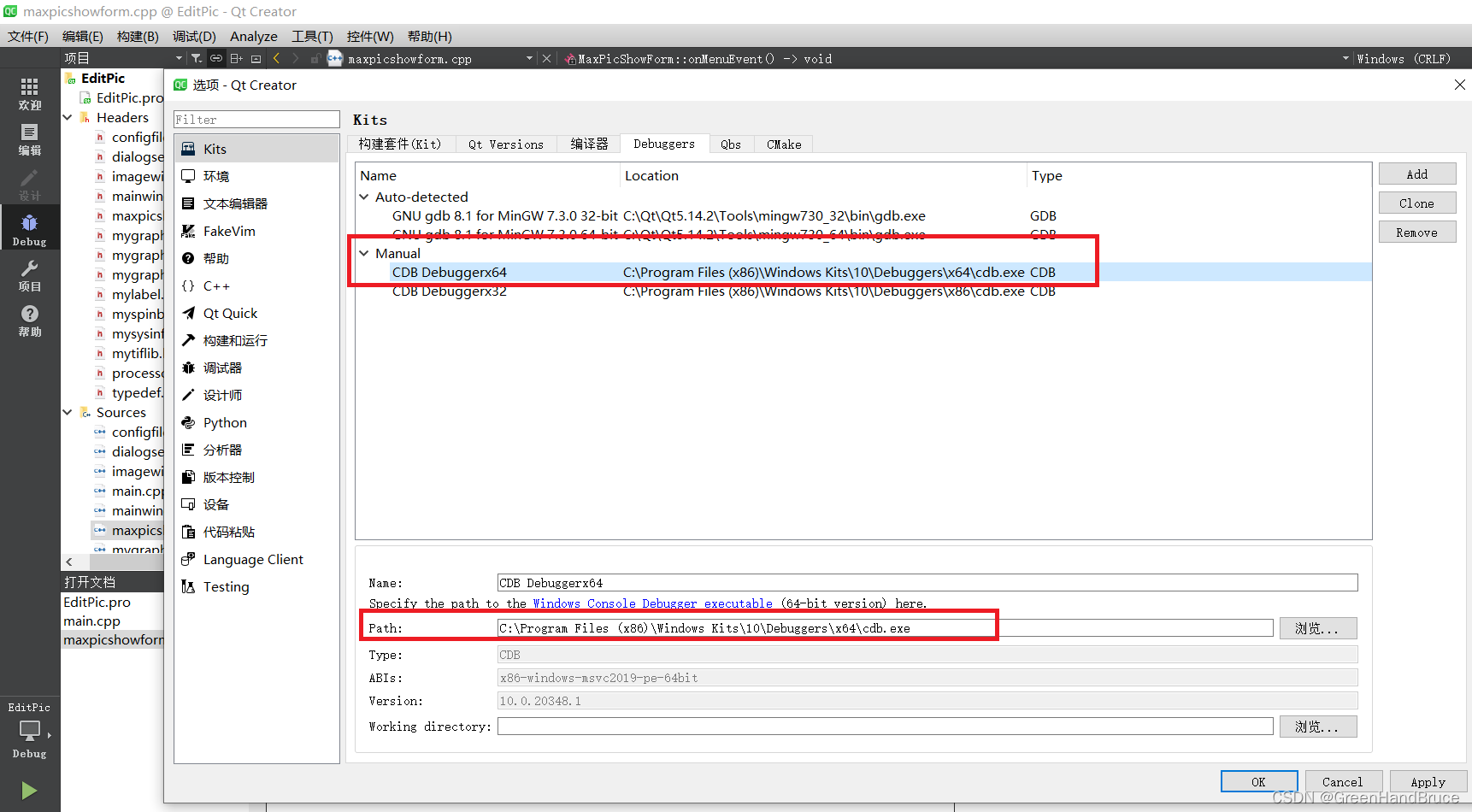点击Add添加2个调试器路径,分别是x64和x86的,改名叫CDB Debuggerx64和CDB Debuggerx32,如下图: