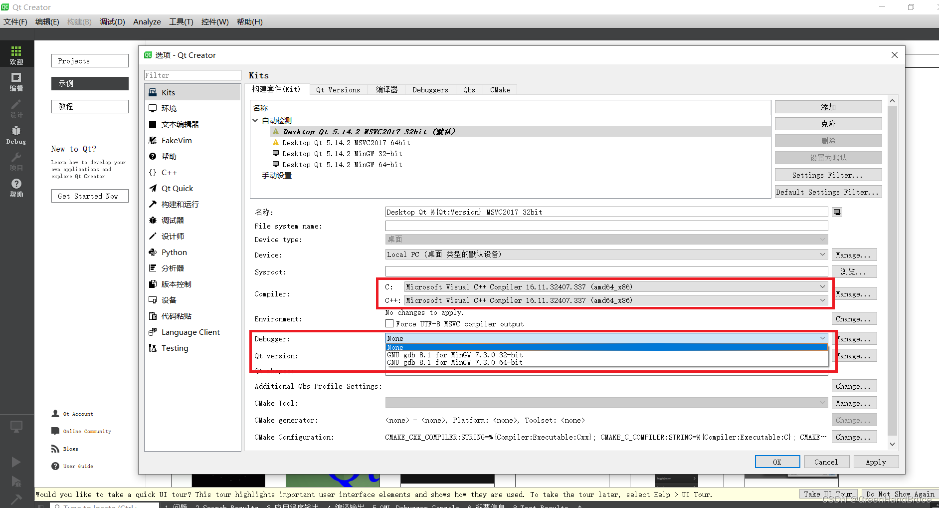 然后回到构建套件页面,选择Debugger编译器,如下图: