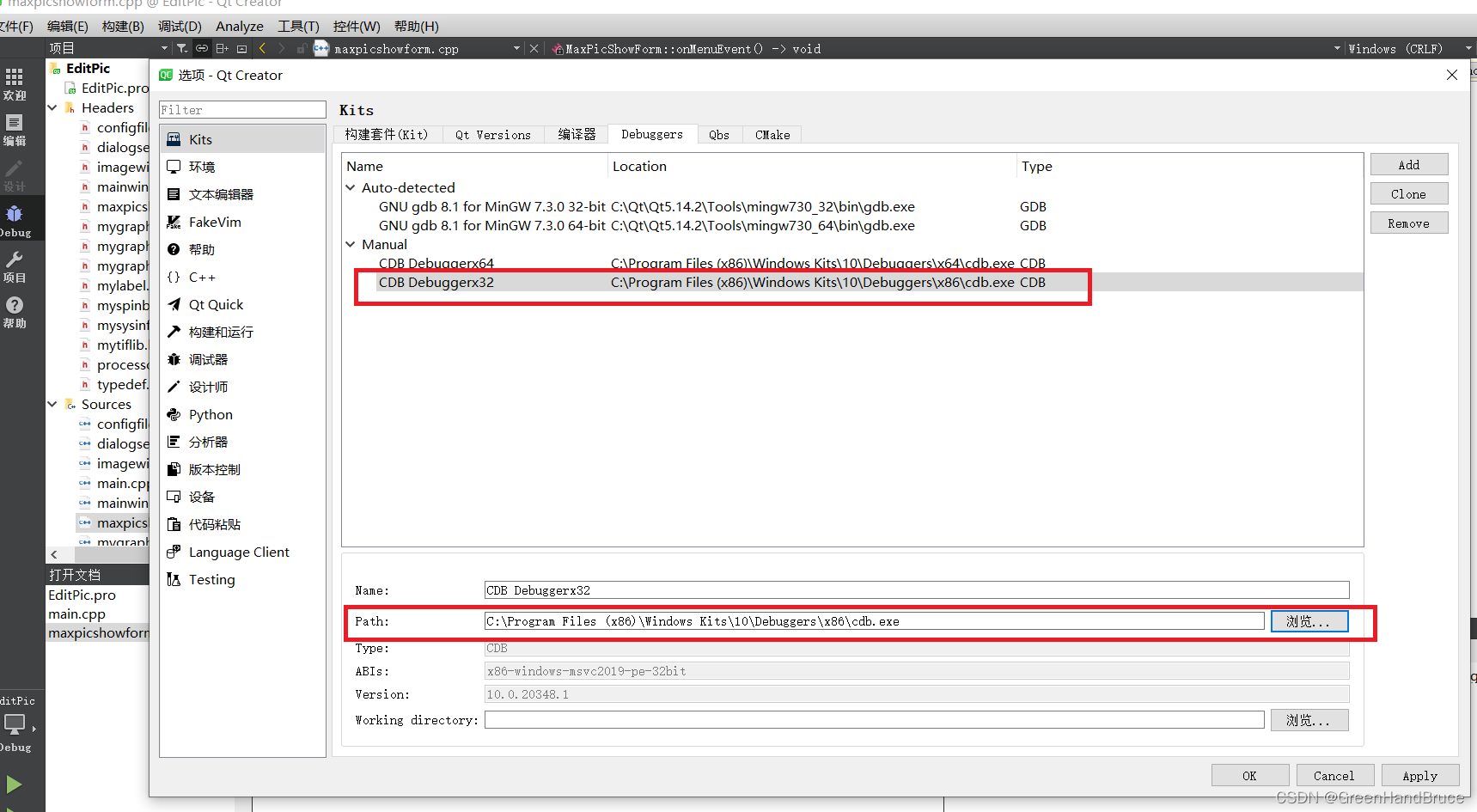 安装之后再次进qtcreator,这时候点击Debugger栏右侧的Manager按钮,