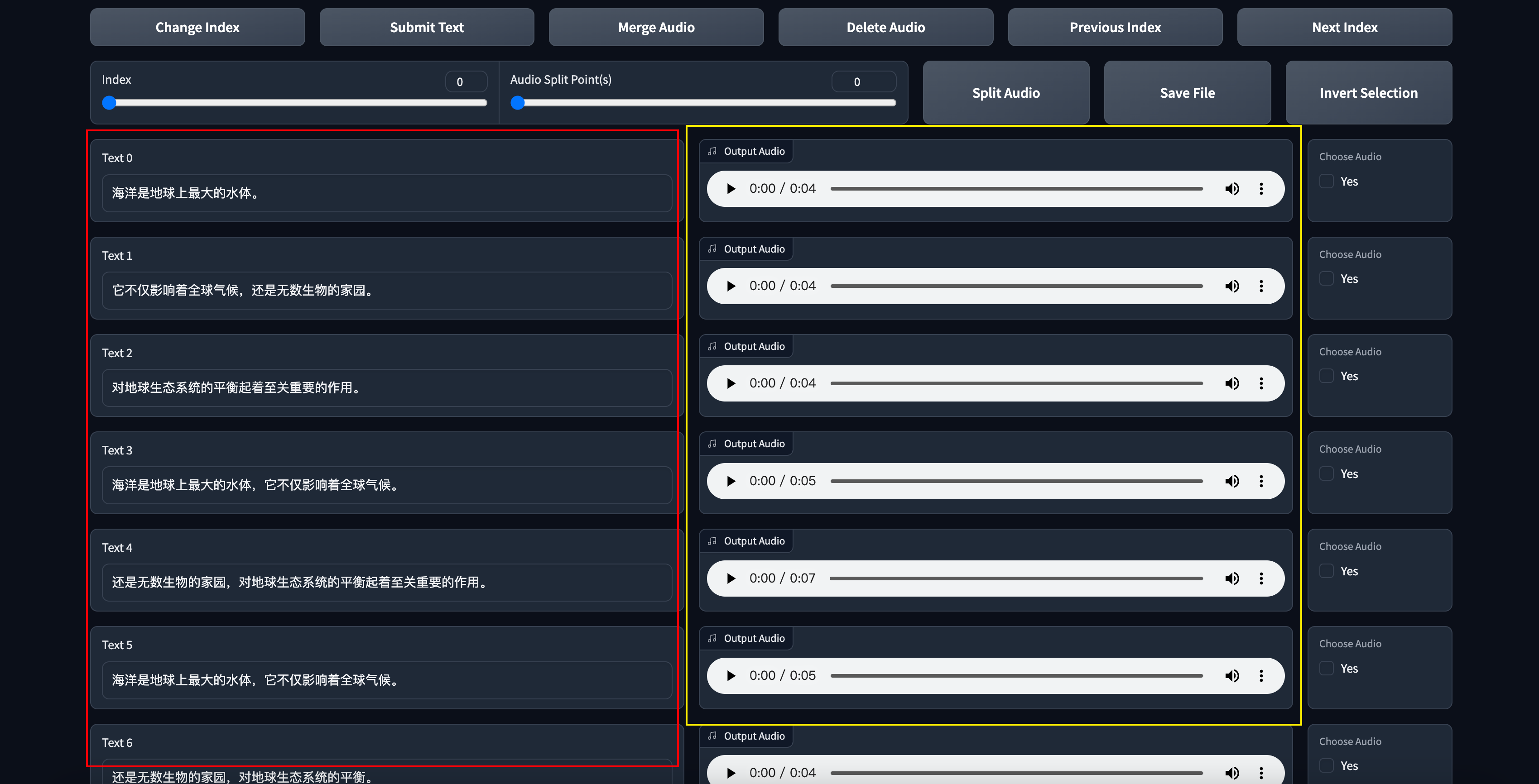 然后会跳转到打标网页,红框区域是根据音频生成对应的文字。黄框区域是对应的音频。这一步要做的是试听,然后根据音频来修改前面的文字和断句。
