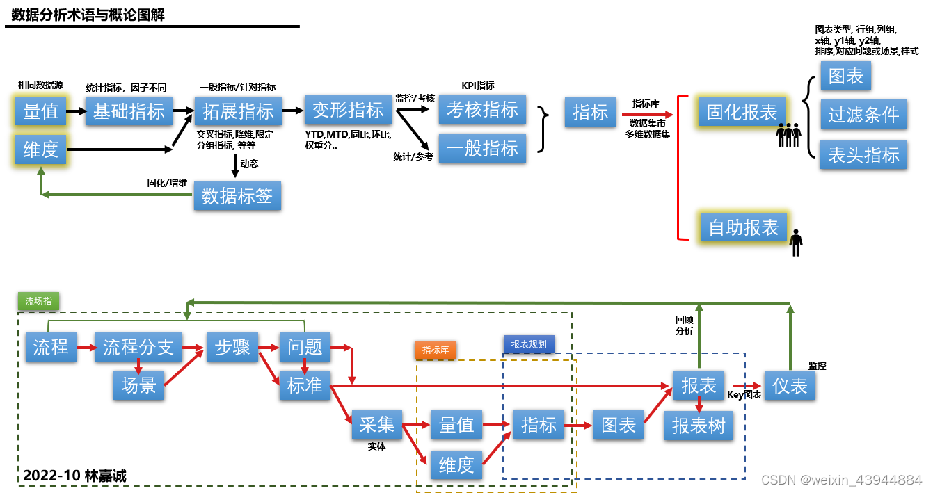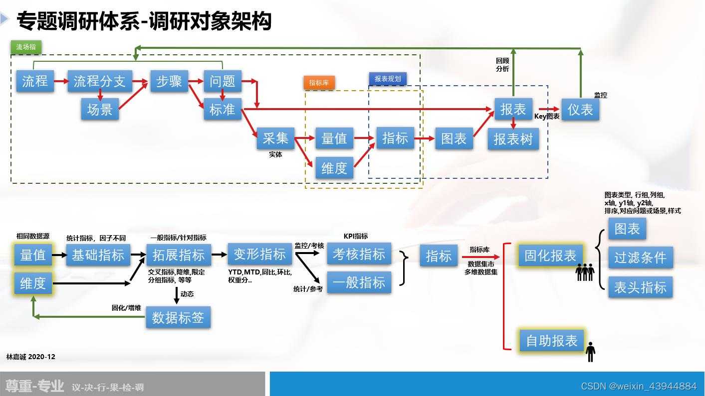 数据分析体系总结-精华图1(指标分类体系,维度标准报表关系,流程场景指标关系) 流程(根本),步骤,场景(价值),标准制度,系统(采集,分析)1. 量值,基础指标,拓展指标(因子不变不限组合),变形指标。2. 考核指标(总监一级,经理及以下二级,一般三级四级)维度标准报表关系(循环生命周期)图表,报表,仪表 (复用组合)