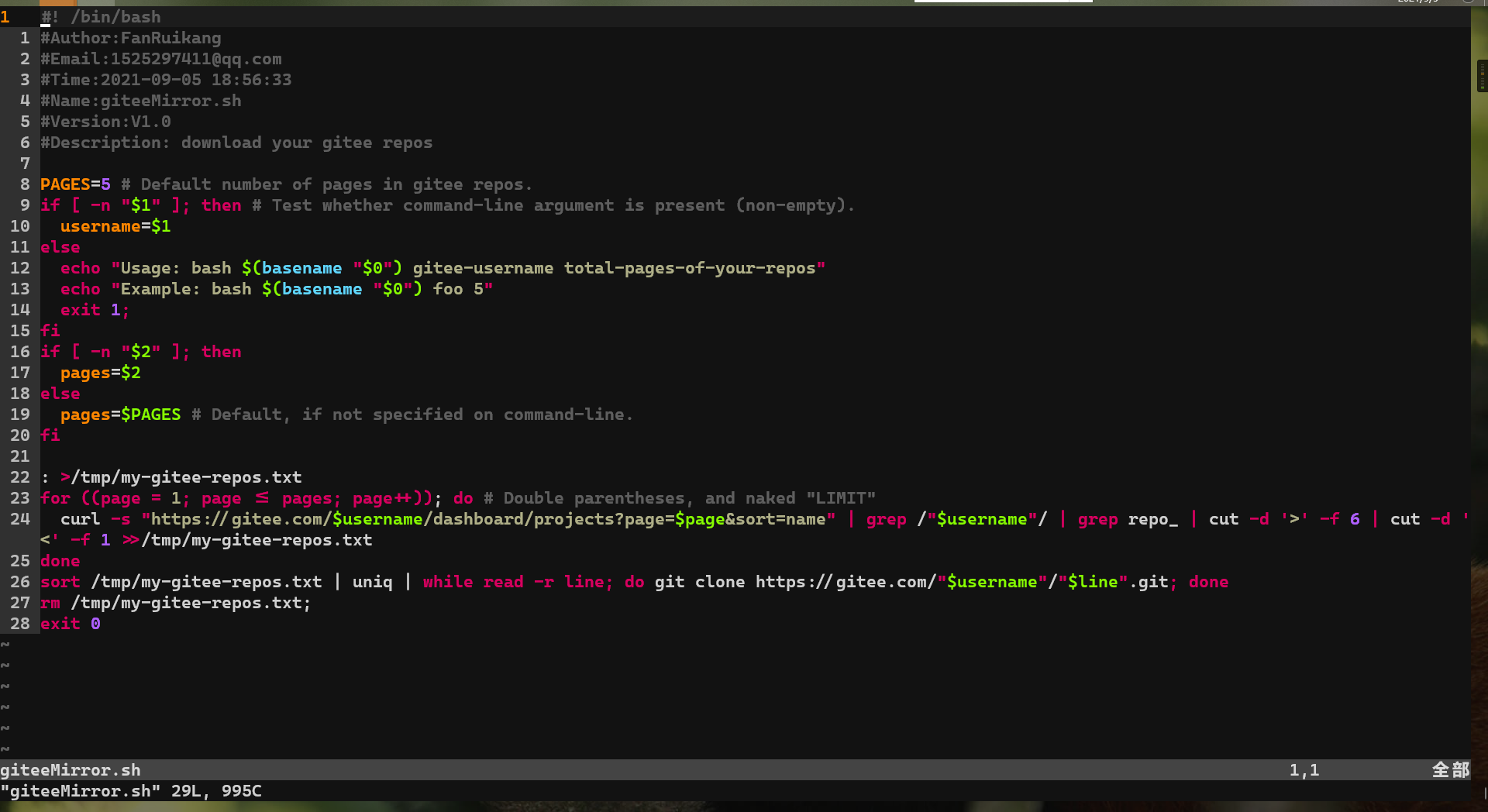 gitee仓库批量clone 一行命令把自己所有的gitee仓库克隆到本地。如下图:命令说明:frk:gitee网站用户名,如下图1所示 5:仓库总页码,如下图3所示 下图2所示,脚步按仓库名顺序下载源码奉上:giteeMirror.sh · frk/awesome-shell - 码云 - 开源中国ps:github仓库俺没梯子网速感人,就不调试脚本了。思路很简单,改下脚本中网址,再根据github中返回的数据格式进行微调加工即可。其它私有git仓库类似。...