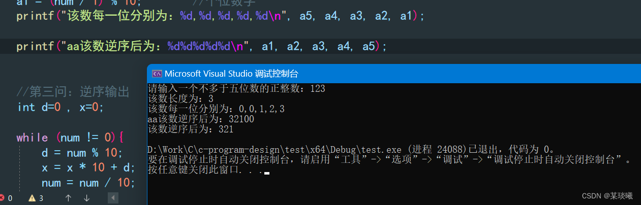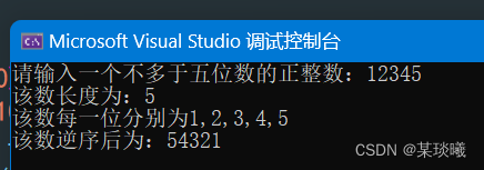 - 由于在第二问就将char s 转为int类型,所以可以直接用:( d = num % 10; x = x * 10 + d; num = num / 10; )。如果直接延用第二问得到的输出,printf("aa该数逆序后为:%d,%d,%d,%d,%d\n", a1, a2, a3, a4, a5); 效果图如下: