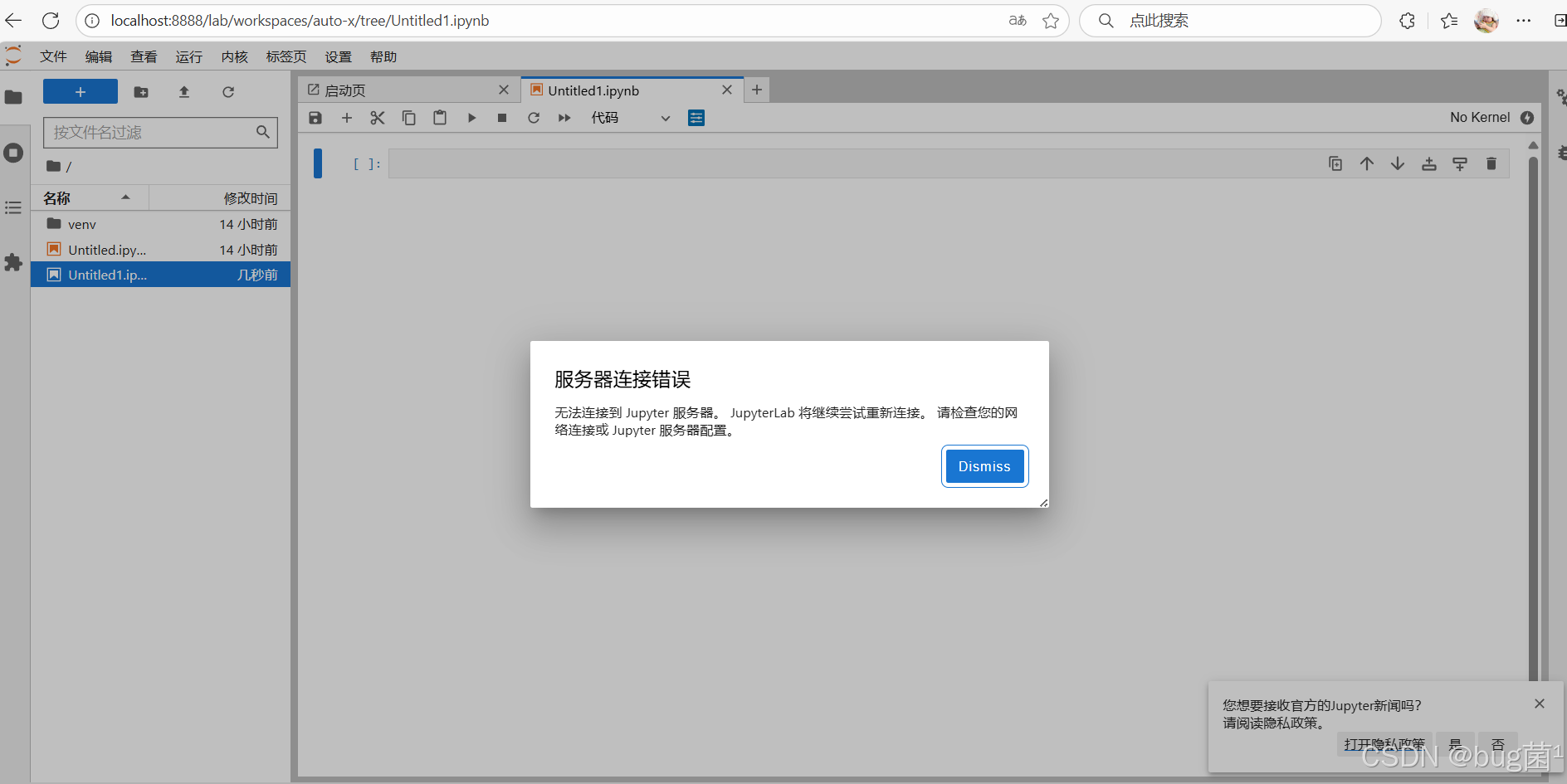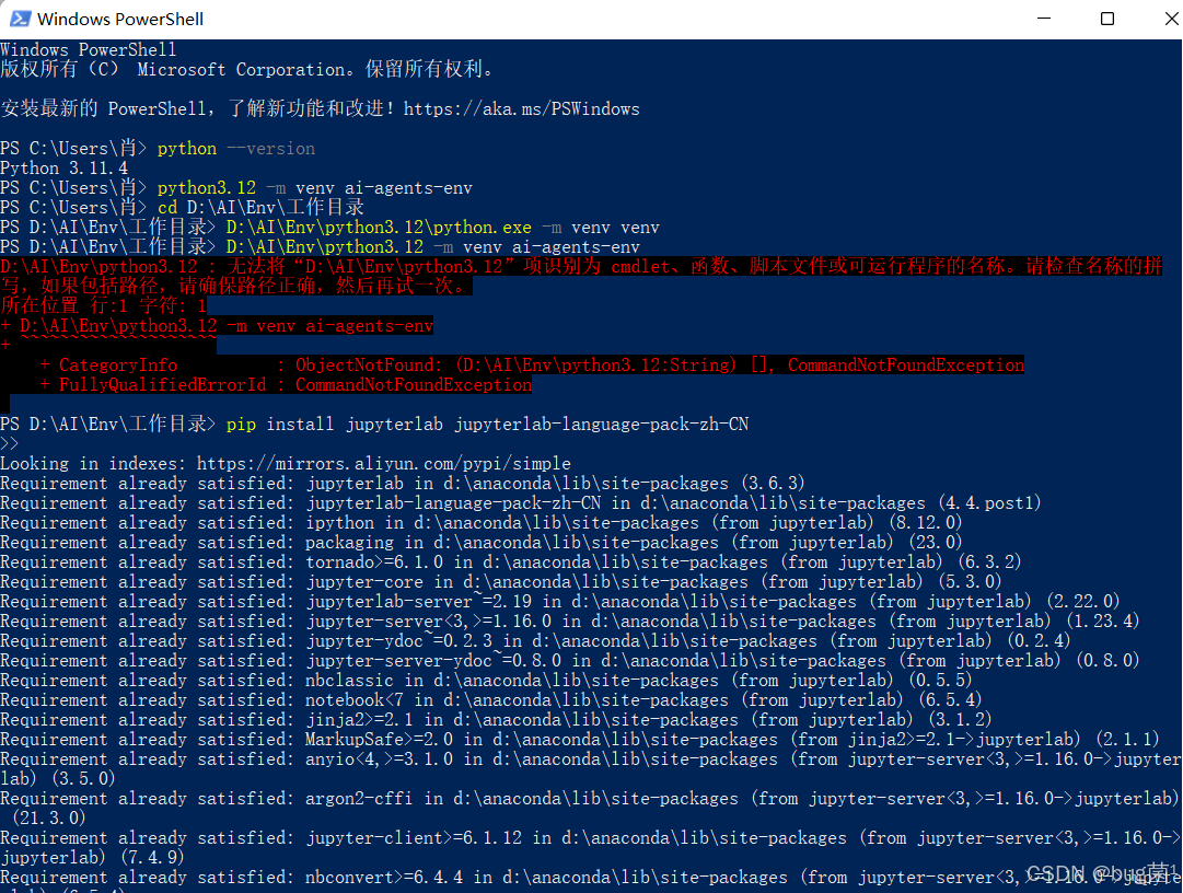 问题描述:之前安配置anaconda安装过多个版本的Python,现在又要求配置好PyTorch运行环境,按照步骤操作安装了python3.12版本,但在最后安装完jupyter lab后跳转网页创建新的笔记本显jupyter环境连接失败,不知道这是不是之前安装的Python版本对jupyter lab的配置有影响导致的链接不上,如何解决?