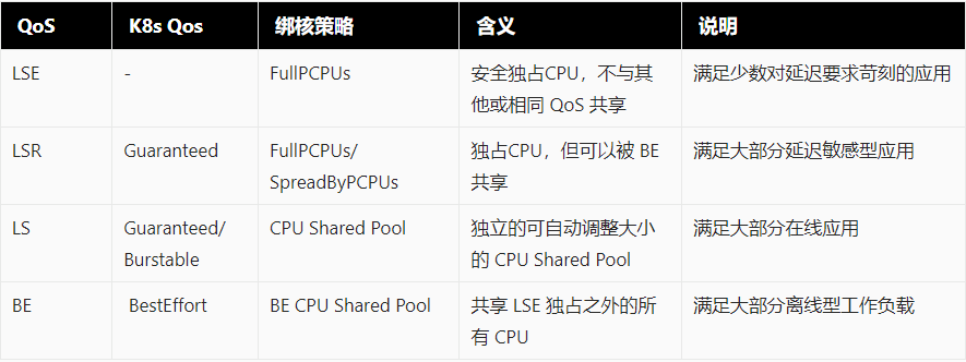 我们把 Koordinator QoS 在线应用 LS 类型做了更细致的划分,分为 LSE、LSR 和 LS 三种类型。拆分后的 QoS 类型具备更高的隔离性和运行时质量,通过这样的拆分,整个 Koordinator QoS 语义更加精确和完整,并且兼容 K8s 已有的 QoS 语义。并且我们针对 Koordinator QoS,设计了一套丰富灵活的 CPU 编排策略,如下表所示: