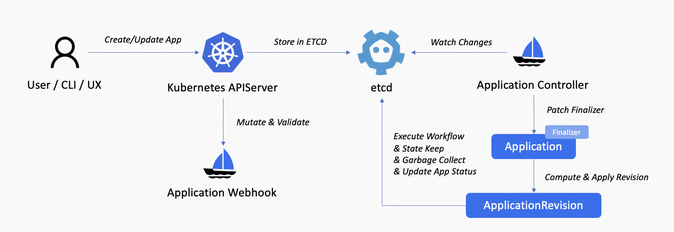 - 用户通过 VelaCLI、kubectl、REST API、VelaUX 等向控制平面上的 Kubernetes apiserver 发送创建/更新/删除应用程序请求。