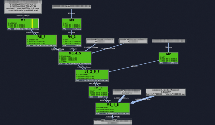 以上执行图已经相当简单,运行速度相比原来任务及增加的上游整体也有一定的提升,但是发现两主task中,m3和m4同样都是4096实例,都是按用户分桶进行的分发,按理此两M应该是可以Shuffle remove进行合并的,问及MaxCompute开发人员大致是一些复杂操作后属性丢失后不能消除Shuffle。
