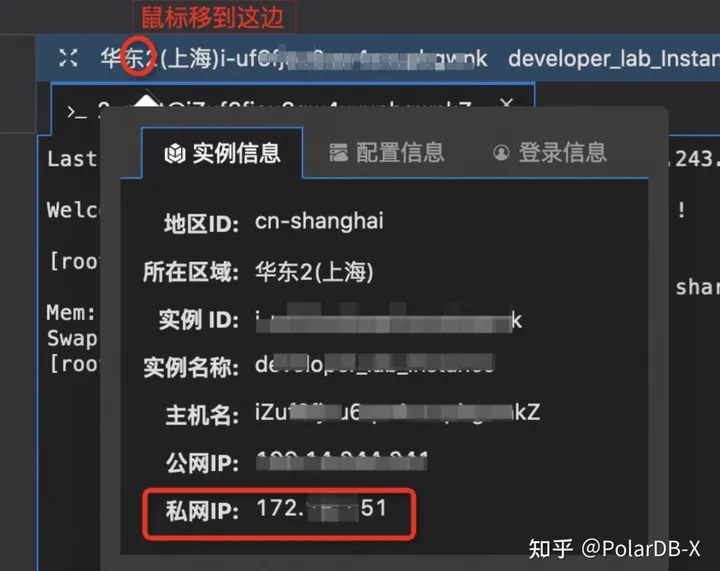 2.2 按i键进入编辑模式,将如下代码复制到文件中,并修改其中的host字段为实验创建资源的私网ip(如何获取参考下图) ,然后按ECS退出编辑模式,输入:wq后按下Enter键保存并退出。