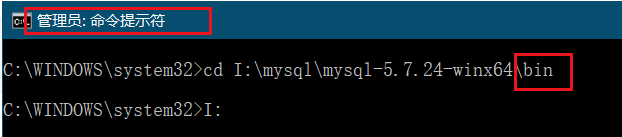 [mysql] #编码 default-character-set=utf8 [mysqld] #端口号 port = 3306 #mysql-5.7.24-winx64的路径 basedir=I:\mysql\mysql-5.7.24-winx64 #mysql-5.7.24-winx64的路径+\data datadir=I:\mysql\mysql-5.7.24-winx64\data #最大连接数 max_connections=200 #编码 character-set-server=utf8 default-storage-engine=INNODB sql_mode=NO_ENGINE_SUBSTITUTION,STRICT_TRANS_TABLES5.管理员打开cmd,进入bin路径