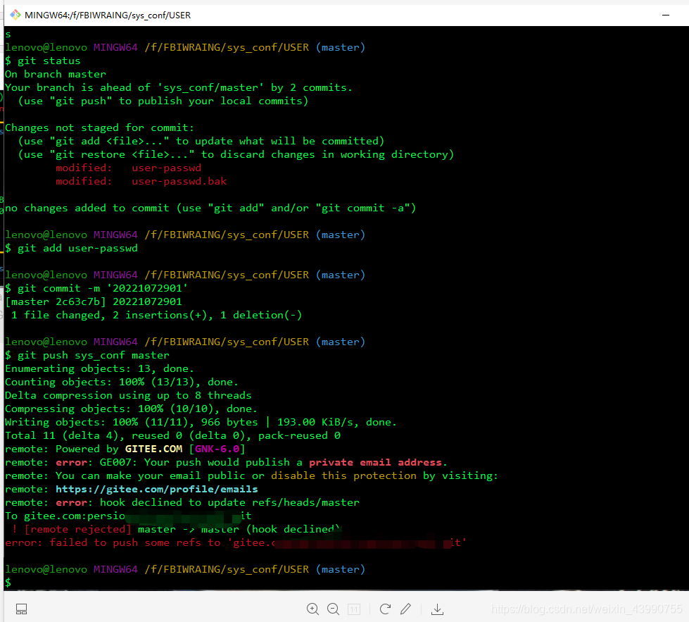 2021-07-30 git push 时报错 好长时间没上传码云了,今天push个文件,没有传上去,仔细一看,是报了GE007,是跟邮箱设置有关系的问题。 意思是我的邮箱是一个private email。 可能是不知道什么时候整的吧,既然知道了问题,直接上图: 就是因为选了这个,去掉就好了,也别忘了点下面的保存修改啊! 然后再push一下, 成功了。 ...