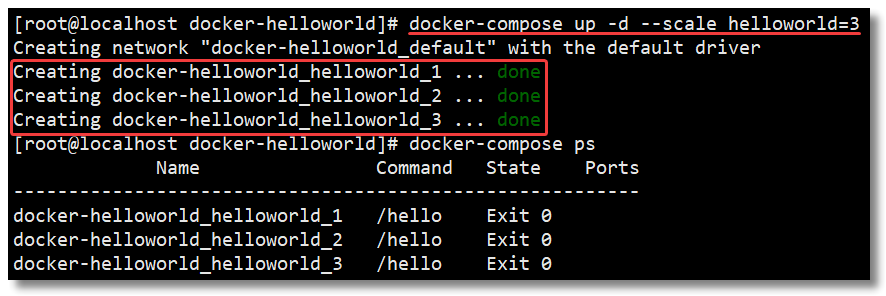# 通过 --scale 指定 helloworld 服务一次性启动 3 个