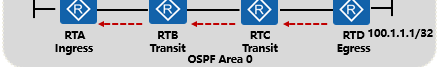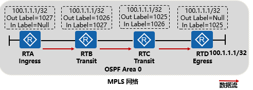RTA收到访问100.1.1.1的数据包时,若进入时为普通的IP报文,查询FIB表,对应的tunnel ID 为非0×0,确定压入标签,封装已分配的标签号1027进行MPLS转发。若进入时为带标签的数据包,则查询LFIB表,封装已经分配的1027标签号进行转发。
