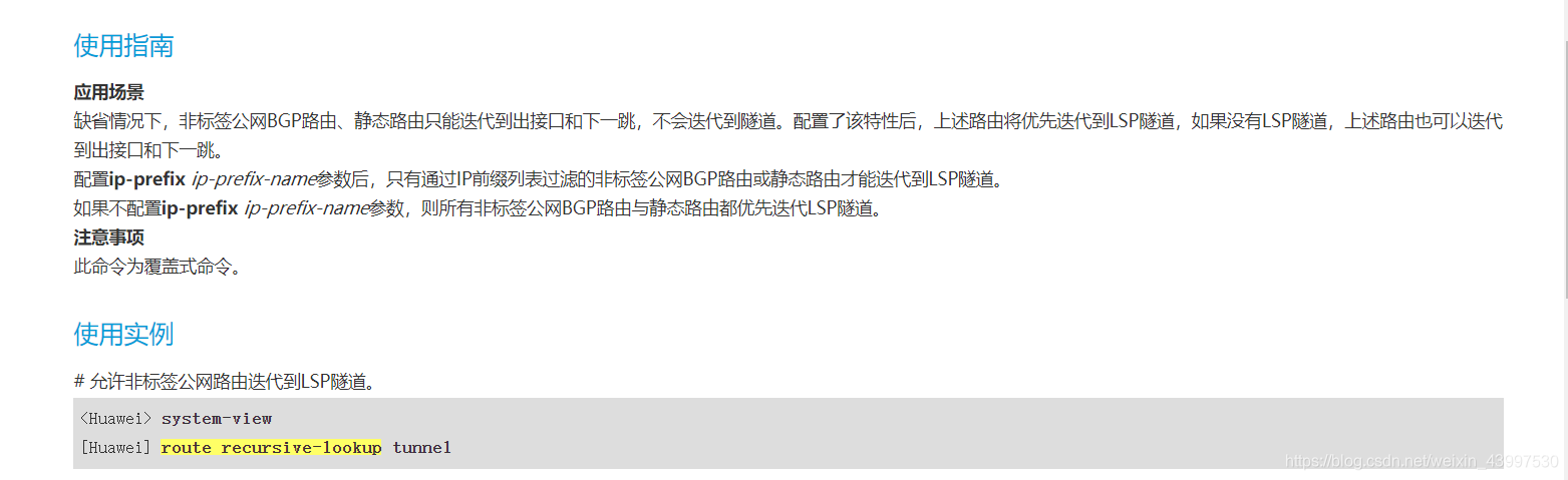 普通的MPLS在解决纯BGP路由黑洞时需要手动开启递归,route recursive-lookup tunnel在没有开启递归时,路由器会查FIB表(路由表),找到出接口发送报文,对端收到报文由于没有运行BGP,不知道下一跳是谁,就会丢弃报文;当配置递归命令后,路由会优先递归到LSP隧道,这样路由就会进入,MPLS的隧道中,当报文传递到未运行BGP的路由器上,会在MPLS的隧道中依靠标签号来进行转发。