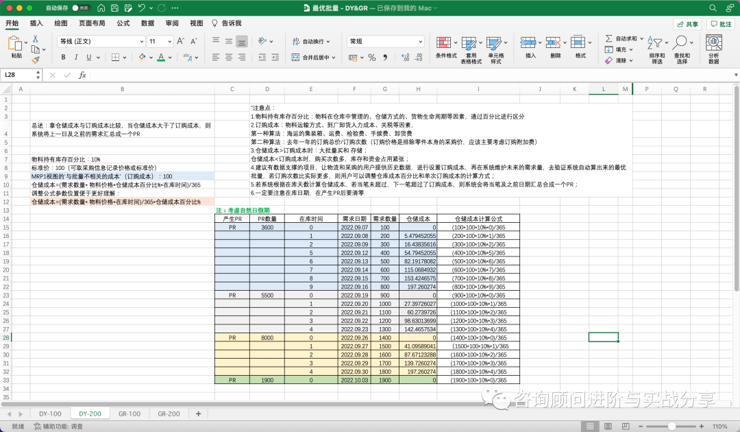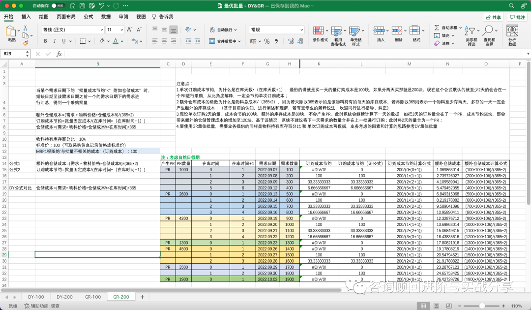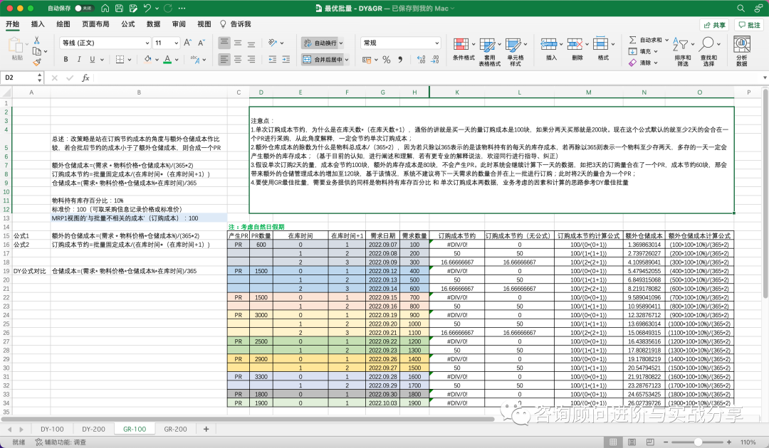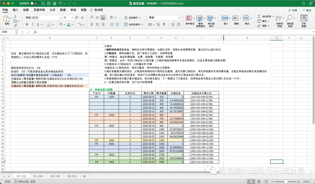 要使用GR最佳批量,需要业务提供的同样是物料持有库存百分比 和 单次订购成本两数据,业务考虑的因素和计算的思路参考DY最佳批量。