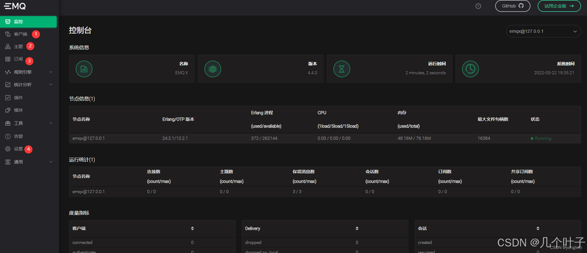 查看EMQX建立的MQTT服务器运行界面,前提是在命令运行窗口中运行EMQX后才可以正常打开本地MQTT服务器窗口窗口