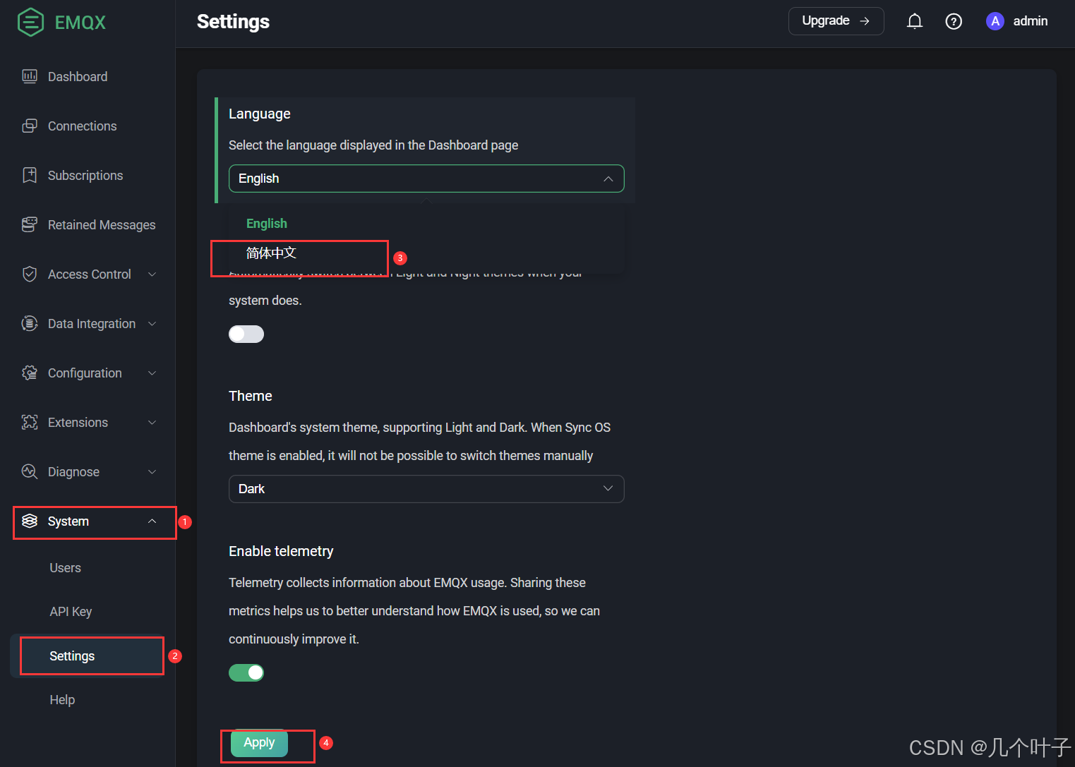 起初刚刚运行EMQX是为英文界面,可以在=设置收纳柜经行更改。