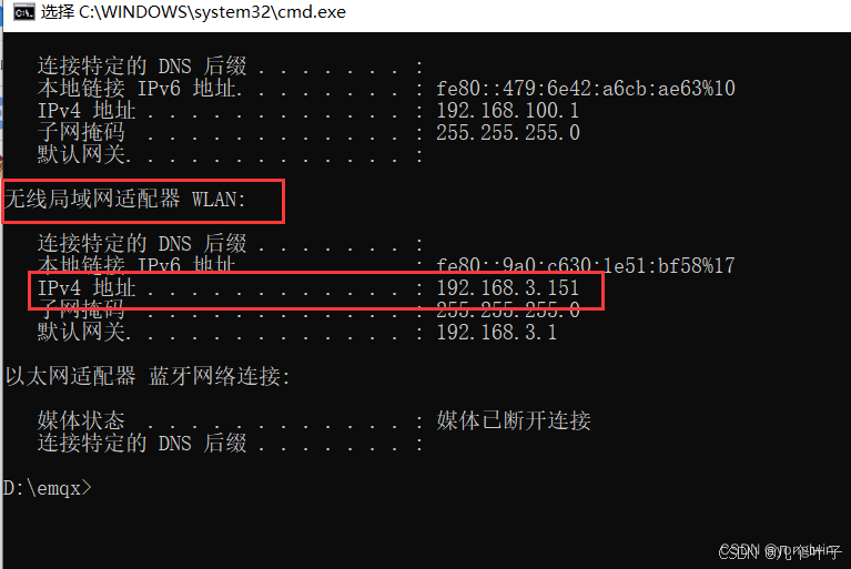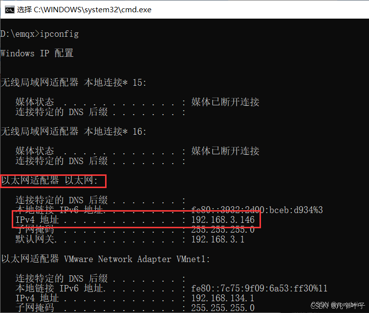 ipconfig,可以看到适配器的ipv4的ip为:以太网适配器:192.168.3.146 或无线局域网适配器:192.168.3.151