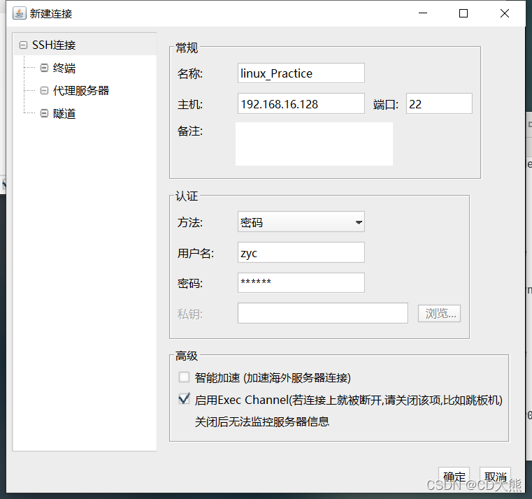 15.输入Linux的ip地址,用户名和密码,然后点击确定进行连接