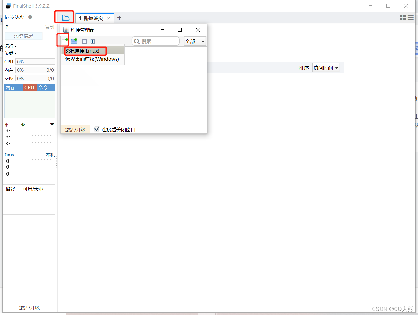 14.点击文件夹图标,点击第一个新建一个连接,选择SSH连接,此连接是连接Linux系统的