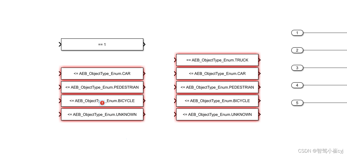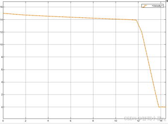 图4为自车与目标车的车速,可以看出自车触发AEBpart后先执行部分减速,但是完全刹停,当AEB系统发现还具有危险时,状态机切换为AEBFull,执行-8m/m^2的减速度直至静止停车。图1为AEB状态机切换结果,结果显示AEB状态逐渐切换为报警,制动状态,从状态1( Standby状态)到状态2(FCW报警状态)再到状态3(AEBpart状态)最后到状态4(AEBFull状态)。2的减速度(此处做了执行延迟考虑到实际执行器的平均延时),当AEB状态切换为AEBFull时,期望加速度发出-8m/s。