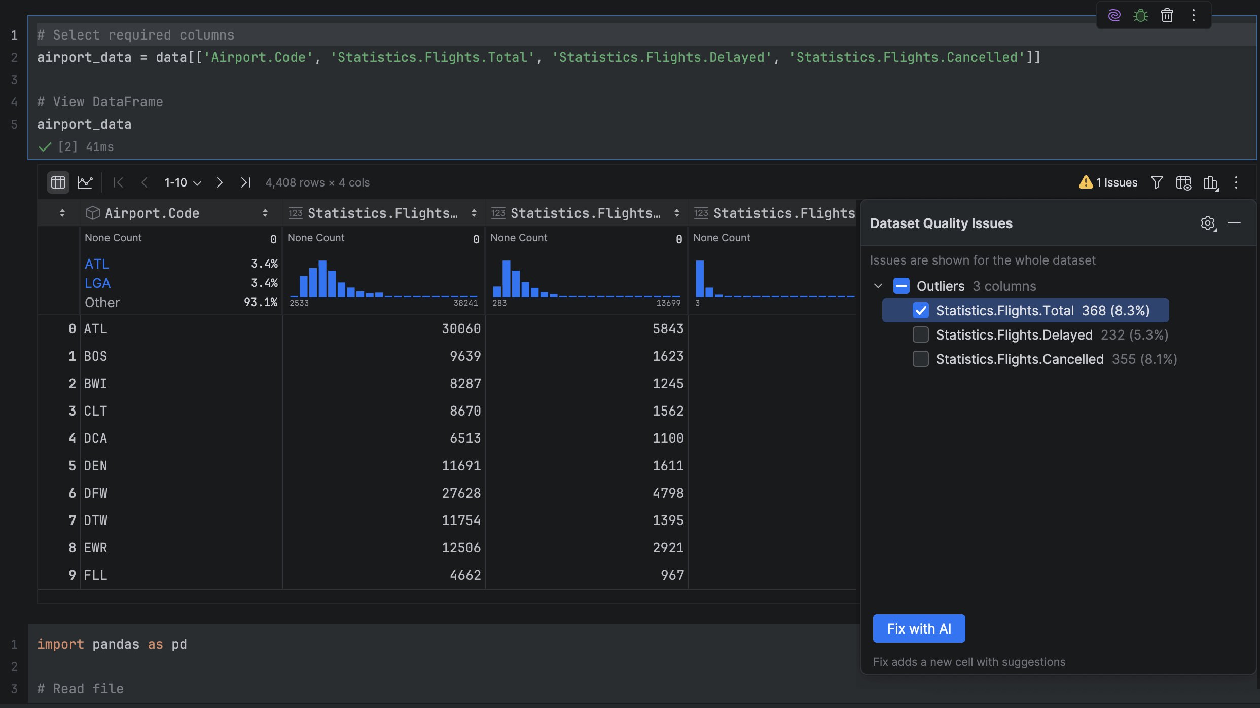 - ✨ 发现问题后,可点击 Fix with AI,自动生成清洗代码(基于 Junie 或 Claude Agent)